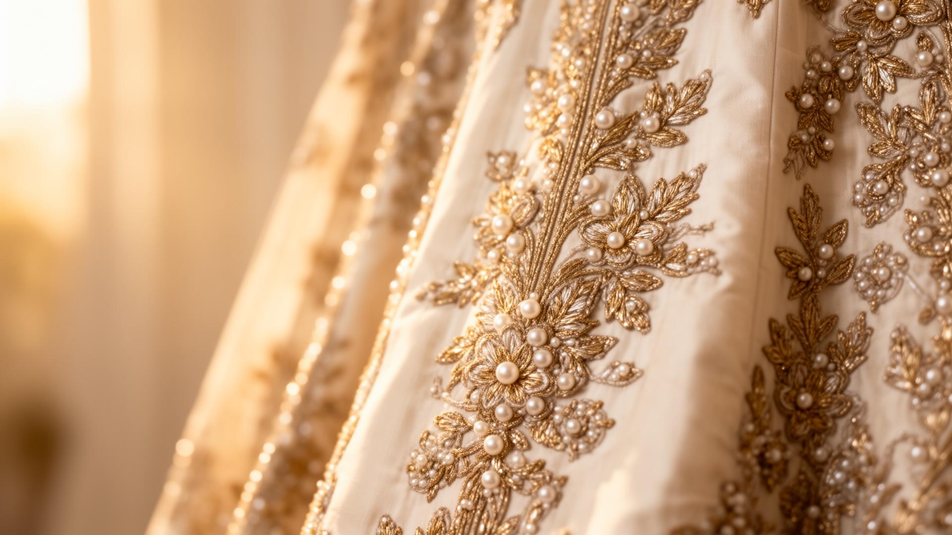 Zardozi, aari and pearl work — placed stitch by stitch by master artisans, taking weeks to perfect.